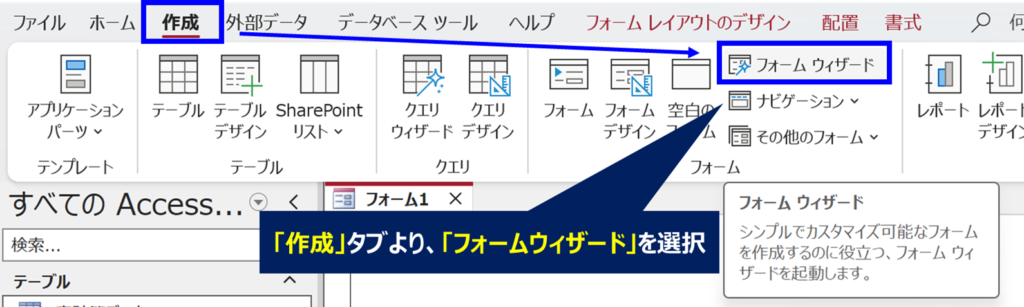 1. 「作成」タブより、「フォームウィザード」を選択する