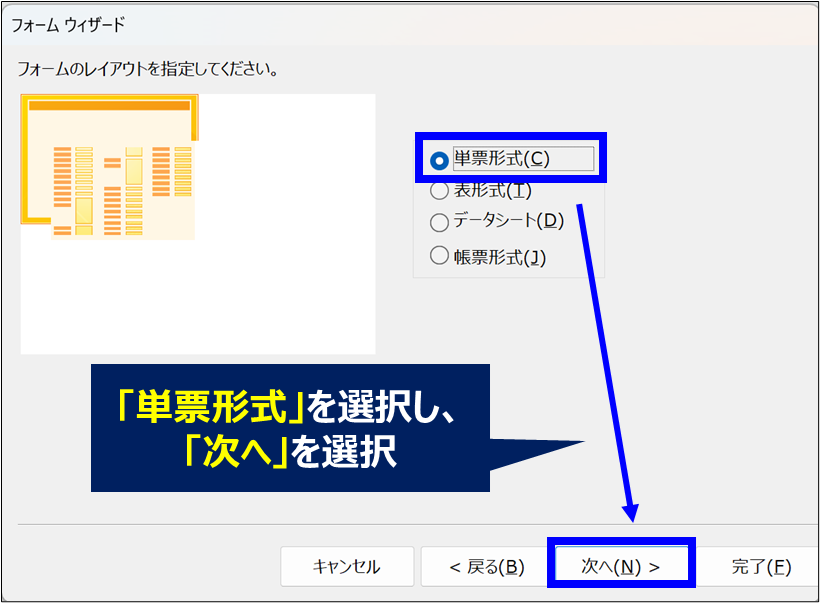 3. 今回は「単票形式」にチェックを入れ、「次へ」を選択する