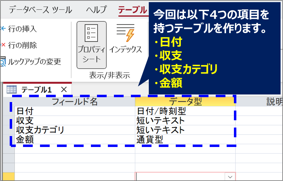 今回は家計簿データを入力するテーブルを例に進めていきます。