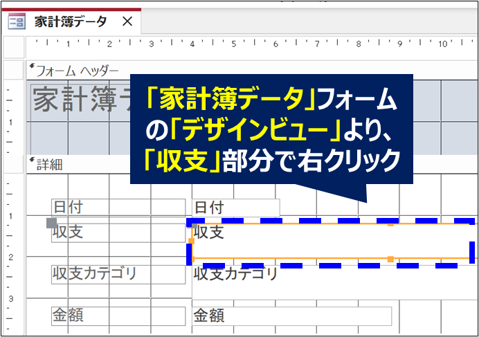 1. 「家計簿データ」フォームの「デザインビュー」で、「収支」部分を右クリック