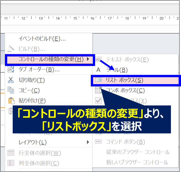 2. 「コントロールの種類の変更」から「リストボックス」を選択