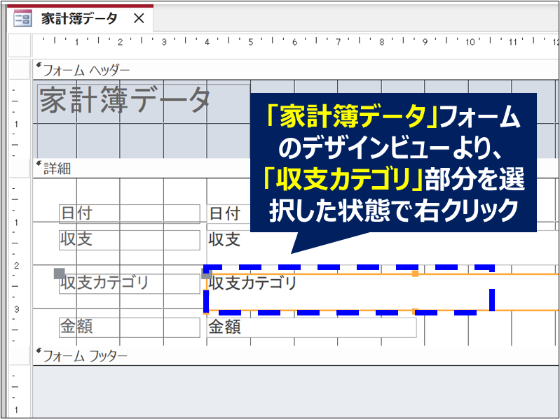 1. 「家計簿データ」フォームの「デザインビュー」で、「収支カテゴリ」部分を右クリック