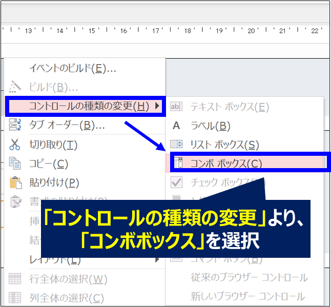 2. 「コントロールの種類の変更」から「コンボボックス」を選択