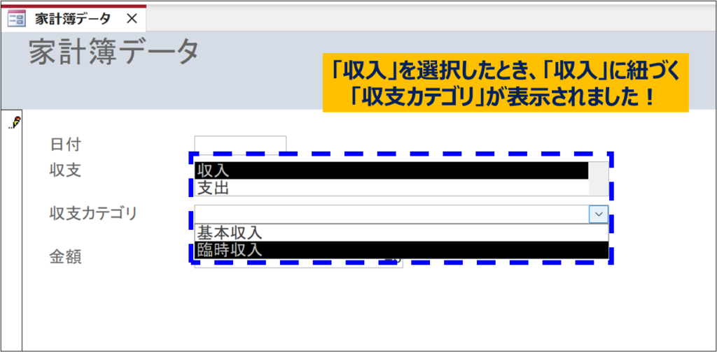Accessフォームで「収支カテゴリ」を連動表示させる