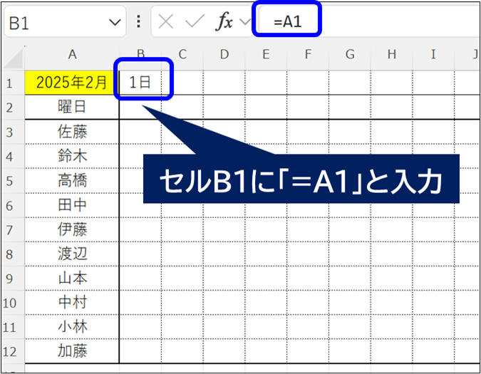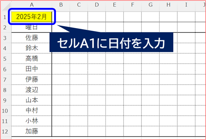 今回はセルA1(黄色セル)に、対象となる日付を入力します。