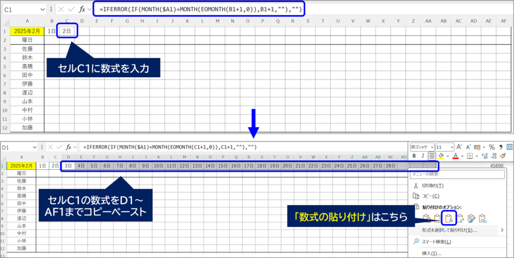 • EMONTH関数を使うことで、対象月以外の日付は表示しないように設定