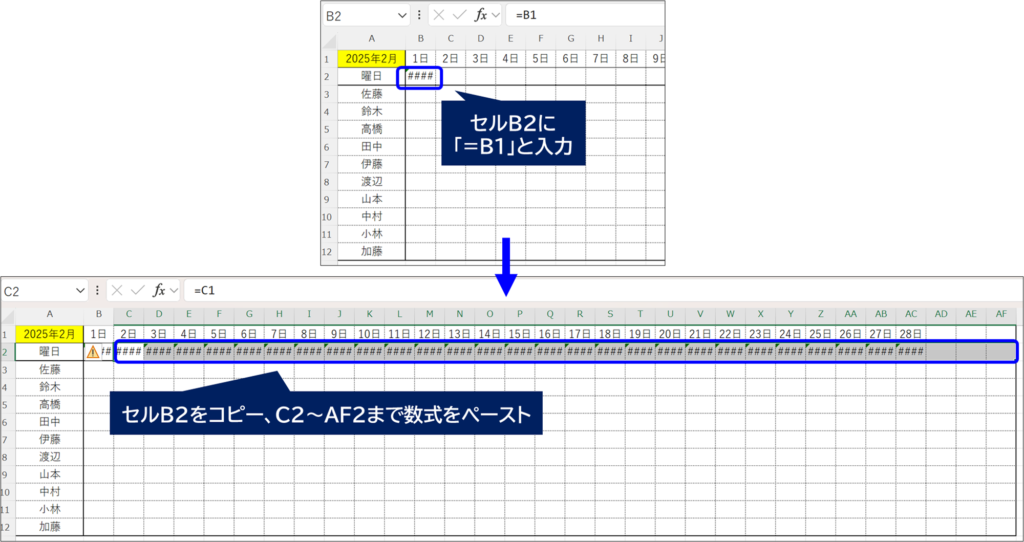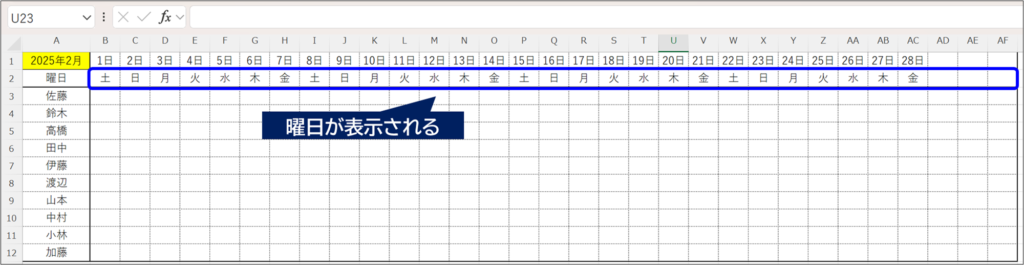 Excelで日付・曜日を自動表示するカレンダーの完成イメージ