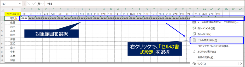 1.変更したい範囲を選択し、右クリック→セルの書式設定を選択