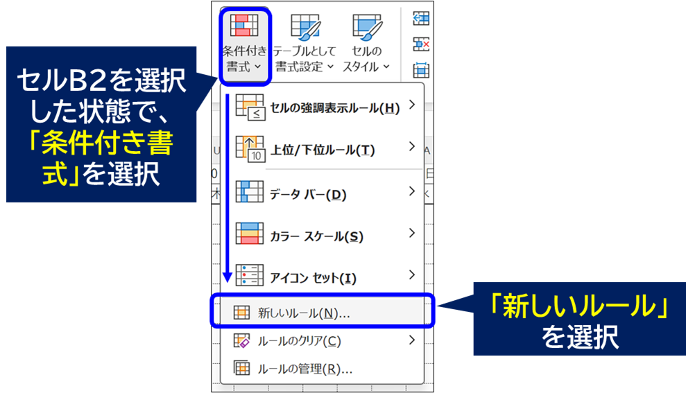 1.対象セルを選択した状態で、条件付き書式→新しいルールを選択