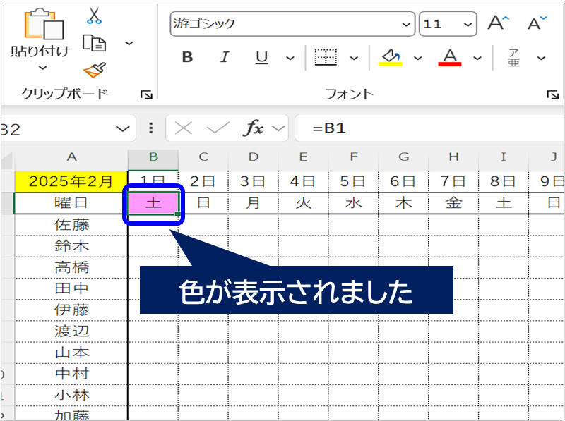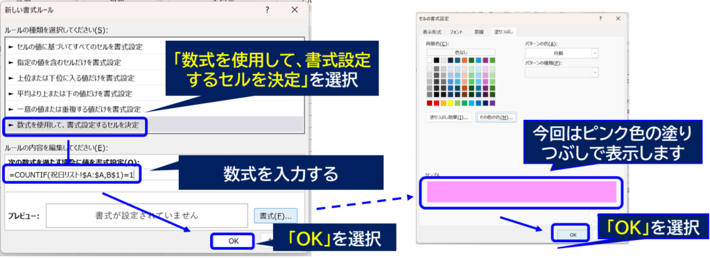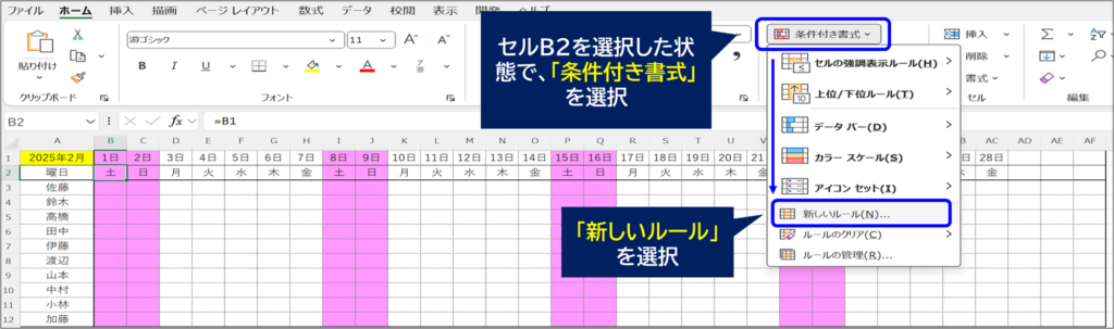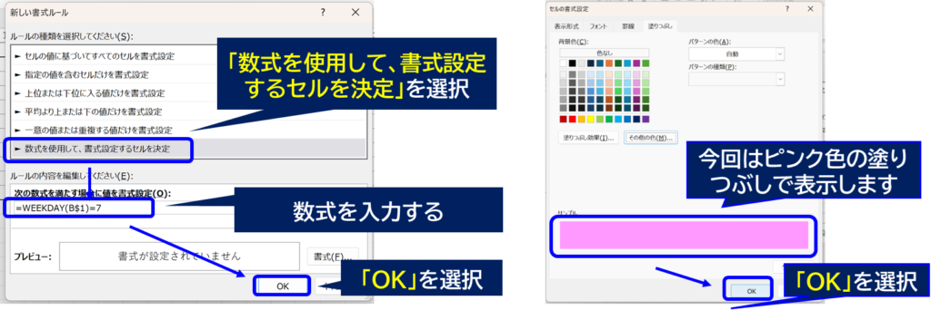 今回は土曜日・日曜日であればピンク色に塗りつぶす書式を設定します。
