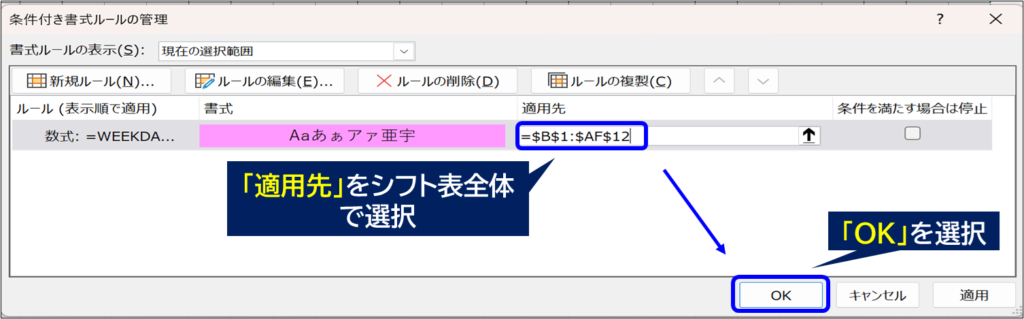 適用先を対象範囲とすることで、土曜日の列全体をピンク色に塗りつぶすことができます。