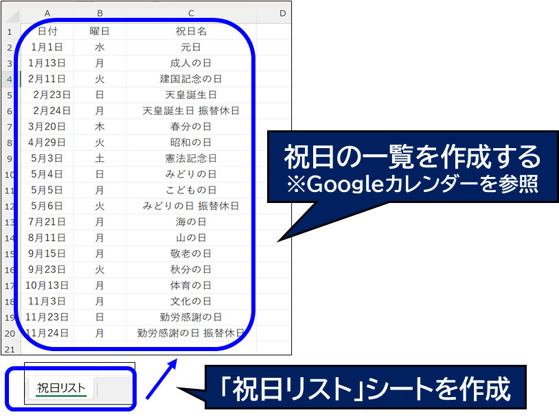 =COUNTIF(祝日リスト!$A:$A,B$1)=1