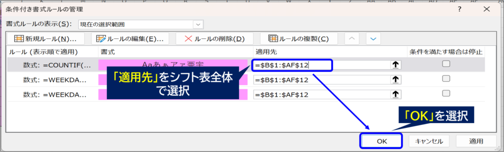 表全体に書式を反映させたい場合は、条件付き書式の「適用先」を対象範囲にすればOKです。