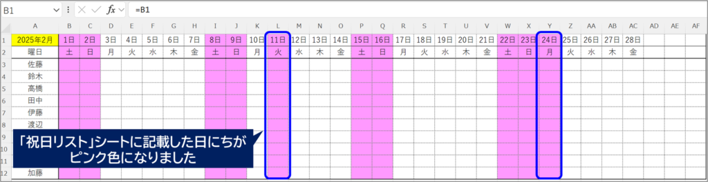 作成した祝日リストシートをもとに、条件付き書式を設定していきます。