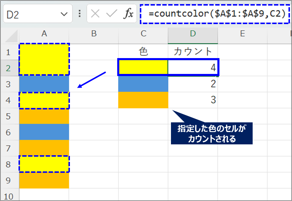 =CountColor(範囲,検索するセルの色)カウントしたいセルの色を指定することで、その色のセルの個数をカウントすることができます。