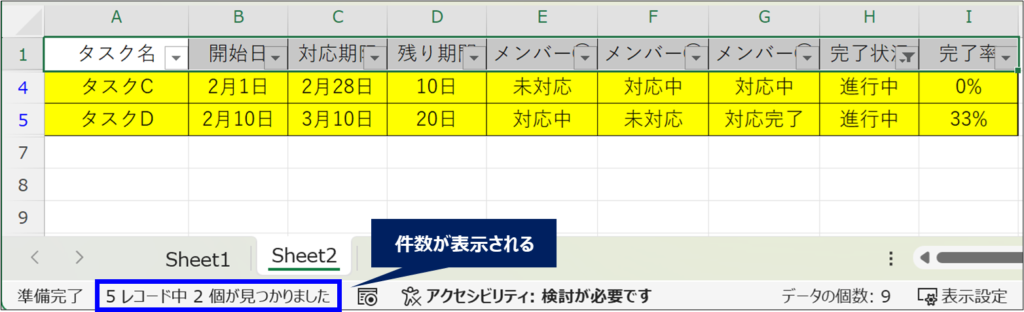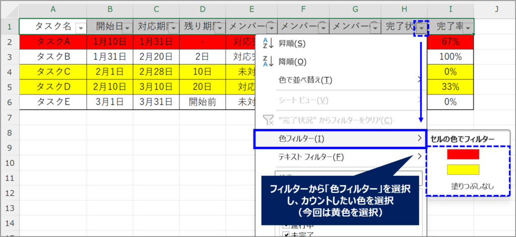 例えば以下のタスク管理表から、黄色行のみをカウントしたい場合、