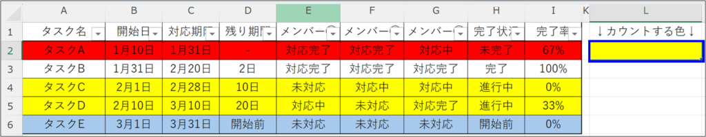 今回は、以下のタスク管理表のA列にある黄色セル(L2セルを参照)をカウントしてみます。