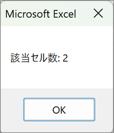 End SubこちらのVBAを実行することで、指定した色付きセルの個数がメッセージに表示されます。