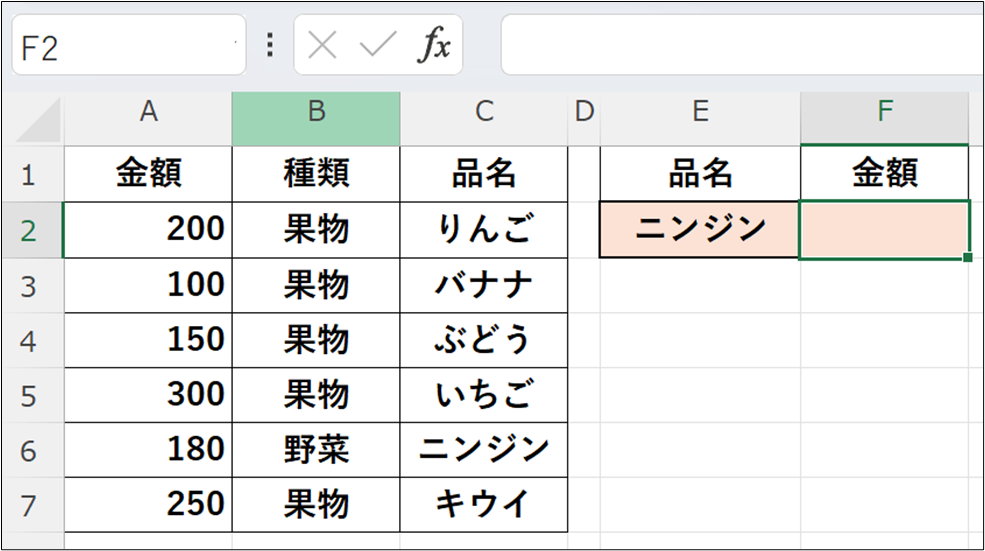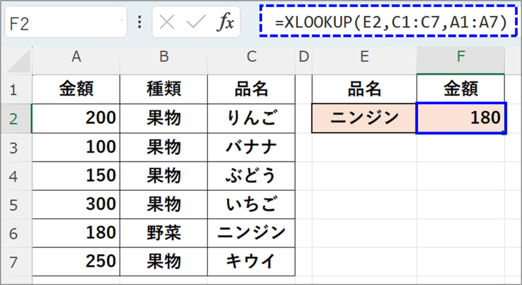 先ほどの表だと、以下のように入力すれば”金額”を検索することができます。