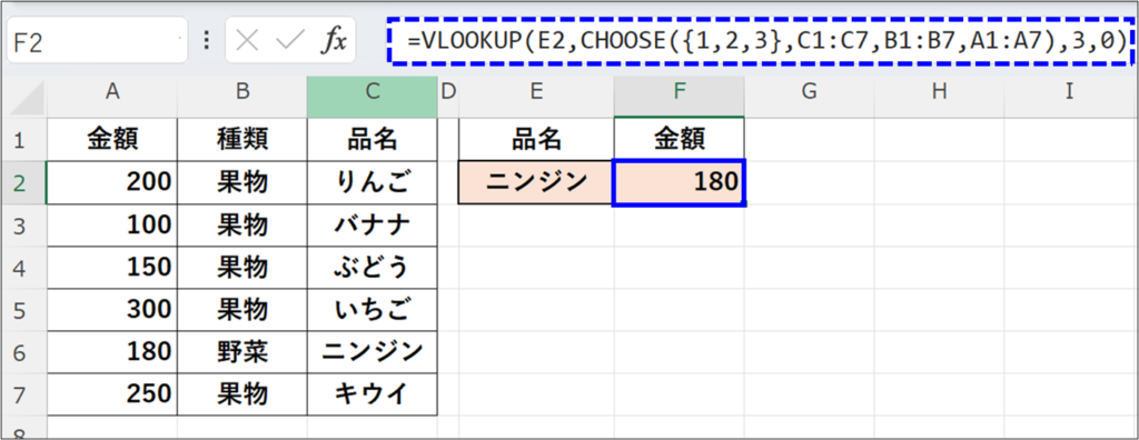 =VLOOKUP(E2,CHOOSE({1,2,3},C1:C7,B1:B7,A1:A7),3,0)これで、左側の”金額”を検索することができます。