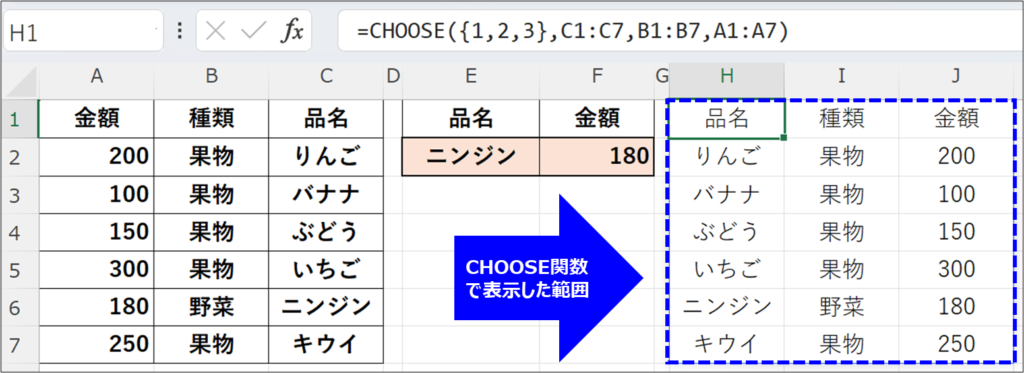 この場合、CHOOSE関数と組み合わせることで、”金額”を検索することができます。