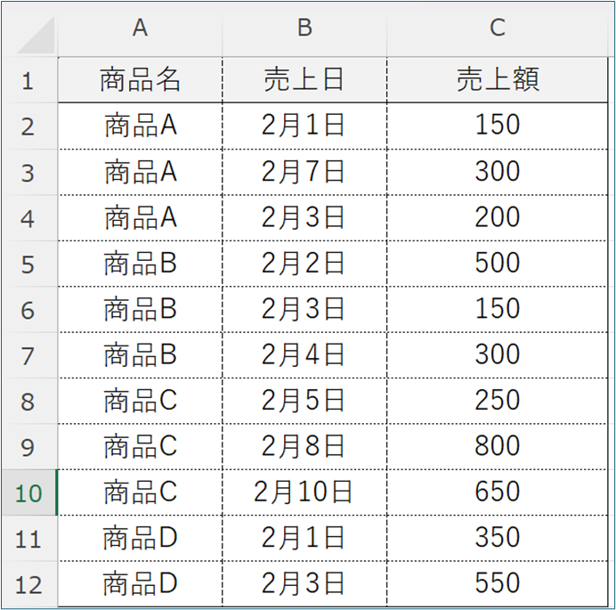 先ほどのデータから商品Aの最新売上データを取りたいと考えたとき、最後の値を取得するだけでは最新データが取得できていません。