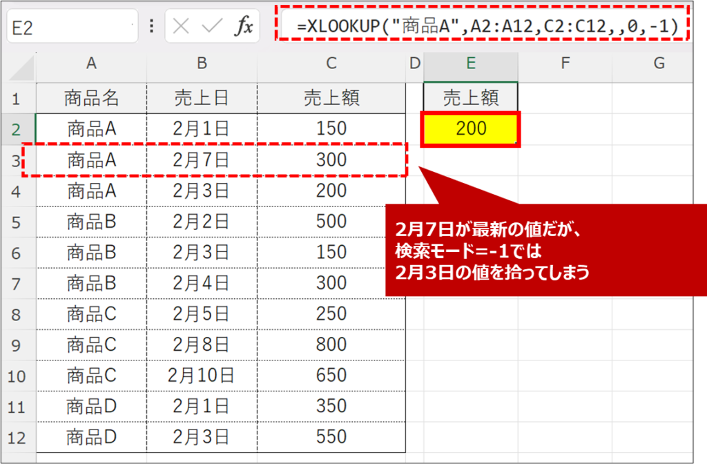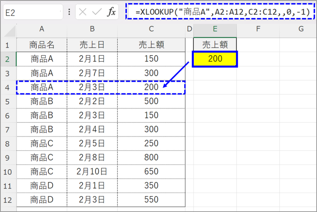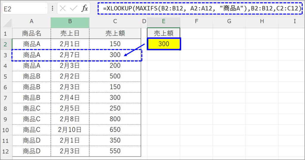 =XLOOKUP(MAXIFS(B2:B12, A2:A12, "商品A"),B2:B12,C2:C12)これで、商品Aの最新の売上額を検索することができました。