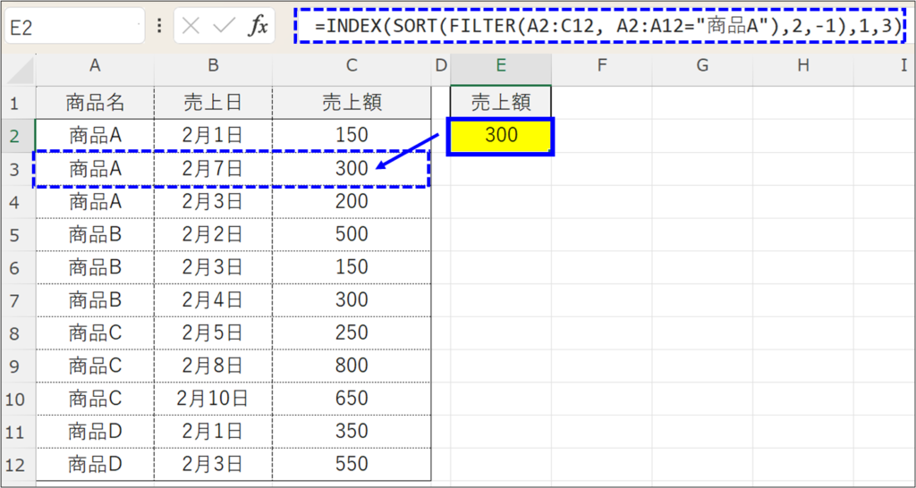 =INDEX(SORT(FILTER(A2:C12, A2:A12="商品A"),2,-1),1,3)この方法でも、商品Aの最新の売上額を検索することができました。