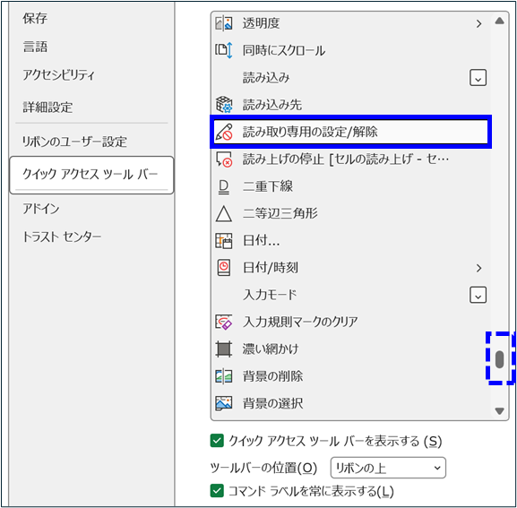 読み取り専用の設定/解除ボタンは、クイックアクセスツールバーに追加すると、便利に活用できます。