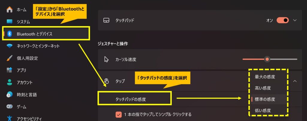 →「設定」より「Bluetoothとデバイス」から「タッチパッドの感度」を選択