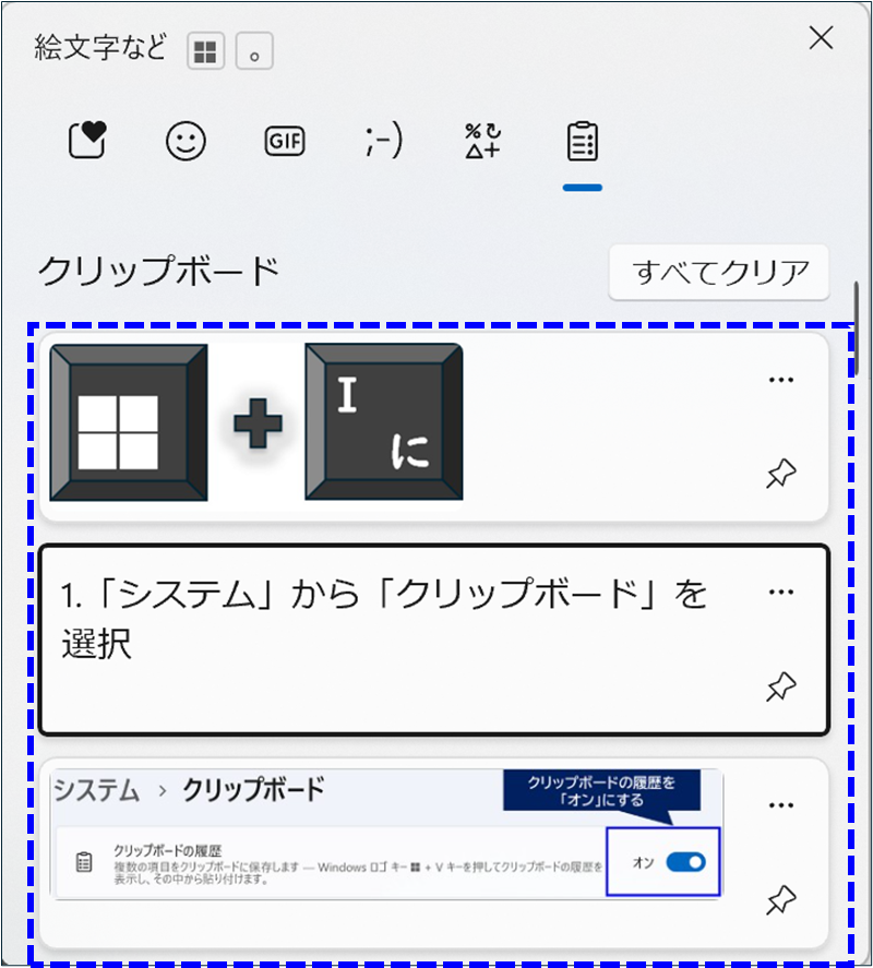 「Win + V」キーを押すことで、クリップボート履歴を確認することができます。